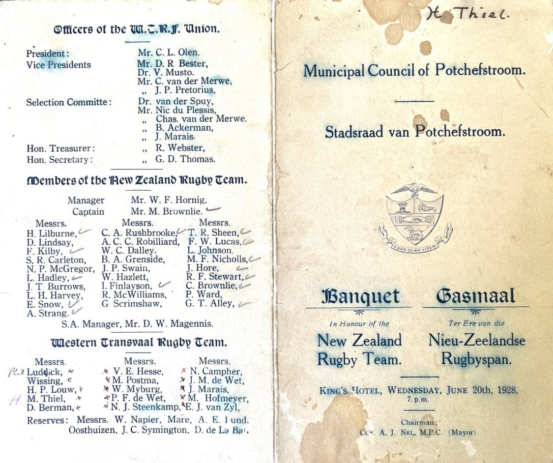 No documents or photos of this event were found in Hermann Thiel’s memorabilia except for the official menu and details of the Banquet given by the Municipal Council of Potchefstroom for the visiting All Black Rugby team. His name is incorrectly given as M Thiel instead of H Thiel.