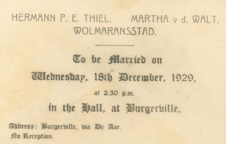 Soon after he arrived in Wolmaransstad he met his future wife Martha van der Walt who was teaching at the local Primary School. In early 1929 they decided to get married and sent out invitations to the wedding which was to take place on 18 December 1929 in the little hamlet of Burgerville in the northern part of the Cape Province near De Aar.