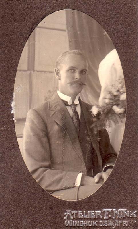 From 1922 until 1925 Karl and his son stayed at the farm Arcadia with his parents while his daughter, Tillie, stayed in Windhoek with the Riedel family. He returned to Windhoek in 1925 and stayed with the Geiger family until his marriage in 1927 to Bertha Anna Schroeder from Germany. In 1928 Karl and Sam Silber opened a General Dealer’s in Gobabis, supplying building materials to farmers returning from Angola. There were no roads and he had to travel on ox wagon trails over great distances. Because of the Depression the business was dissolved and until 1931 he was involved in informal trading from Gobabis. He then moved to the farm Arcadia (Kuppen) where he transported cream for his sister, Maria Schimming.  He then moved back to Windhoek where he made a living by selling firewood. From 1933 he worked for the firm Slith Davis and then again for Rudolph Schuster. During the Second World War he joined the wholesaler Metje and Ziegler where he remained until shortly before he passed away in 1974. He built a house in the suburb Kleinwindhoek where he lived from 1937 until his death in 1974.
