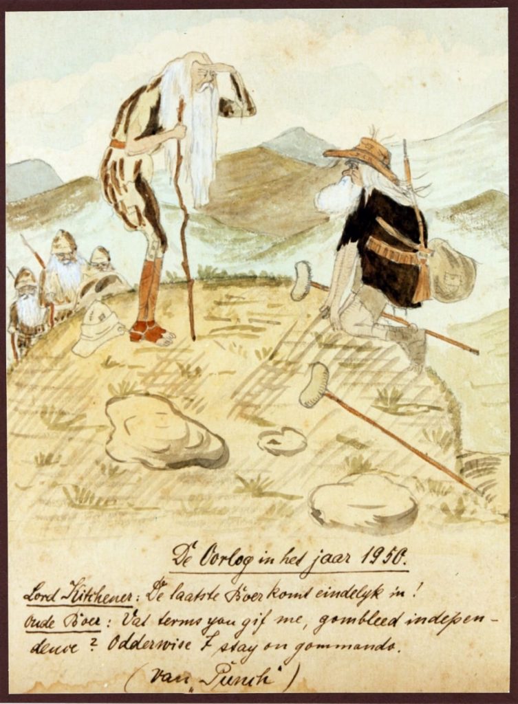 I obtained a copy of the original cartoon as published in Punch Almanack in 1902. It shows an old and decrepit Lord Kitchener with his long beard, crooked walking stick and his helmet on the ground beside him. The old and tattered Boer is on his knees with his gun slung over his shoulder and his two crutches on the ground beside him.